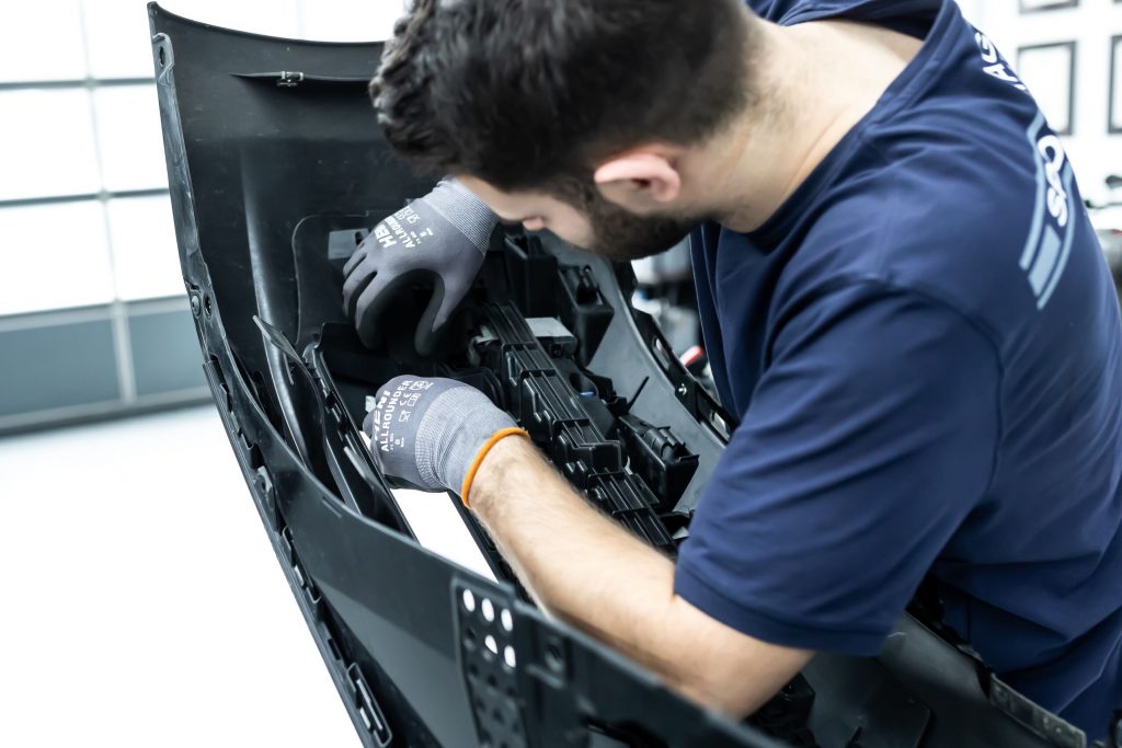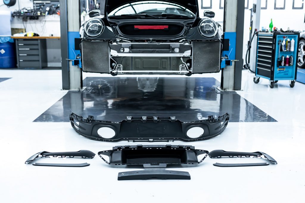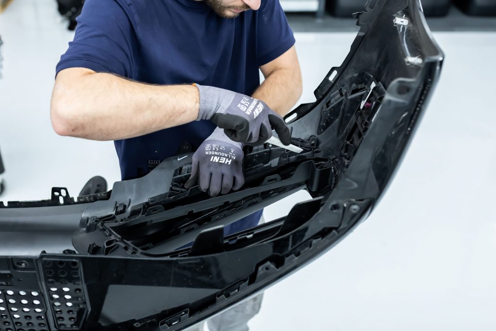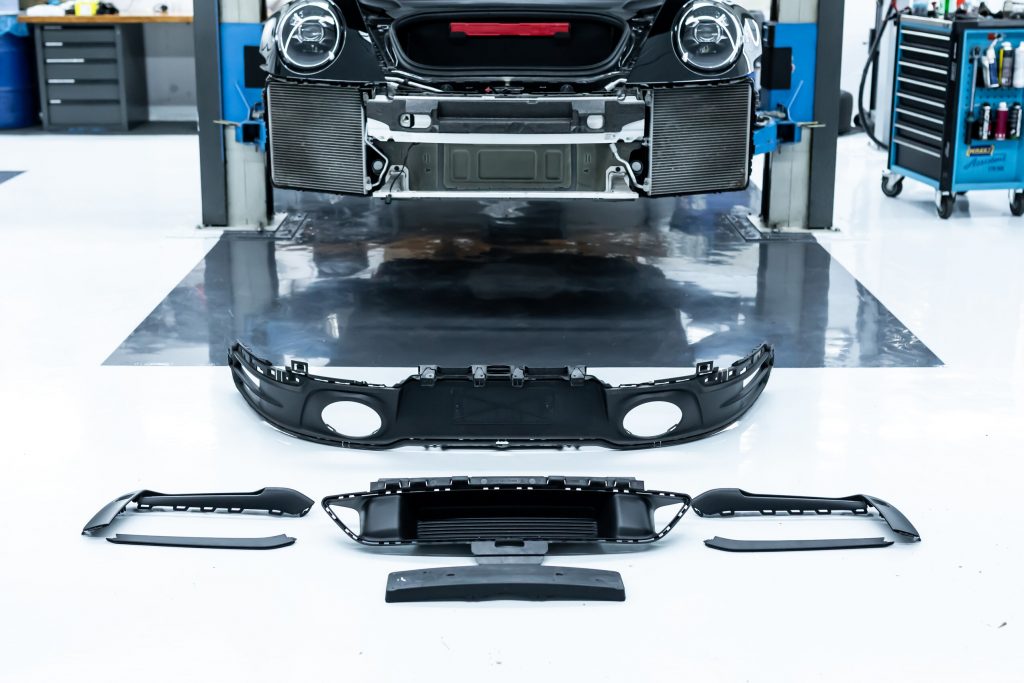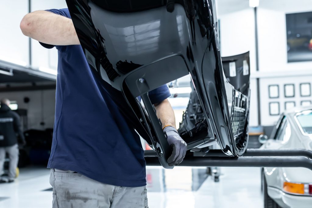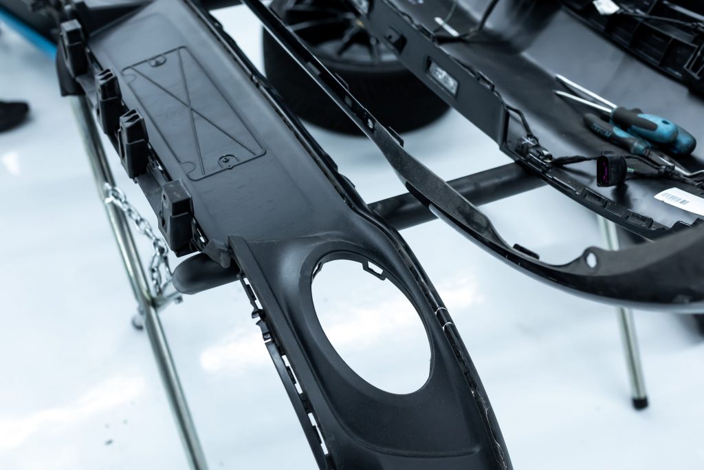 Im nächsten Schritt haben wir uns den vorderen und hinteren Stoßfängerverkleidungen gewidmet. Diese wurden vorsichtig demontiert und anschließend in ihre Einzelteile zerlegt, um die unlackierten Teile zu isolieren. Die Bug- und Heckverkleidungen wurden sicher eingelagert, um später wieder sorgfältig montiert zu werden.